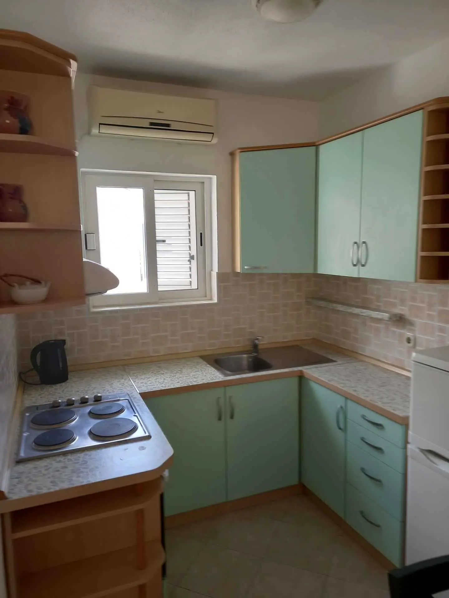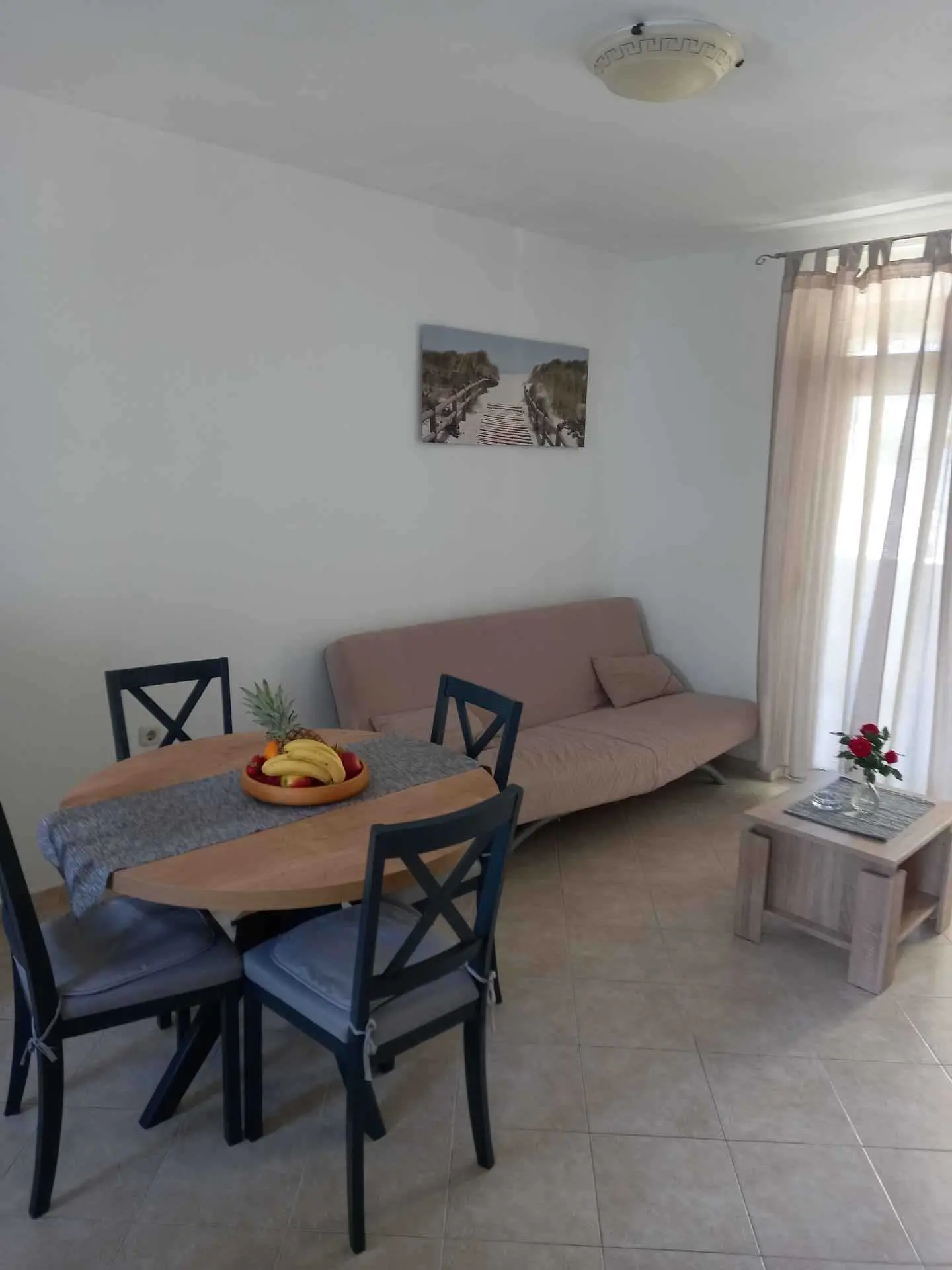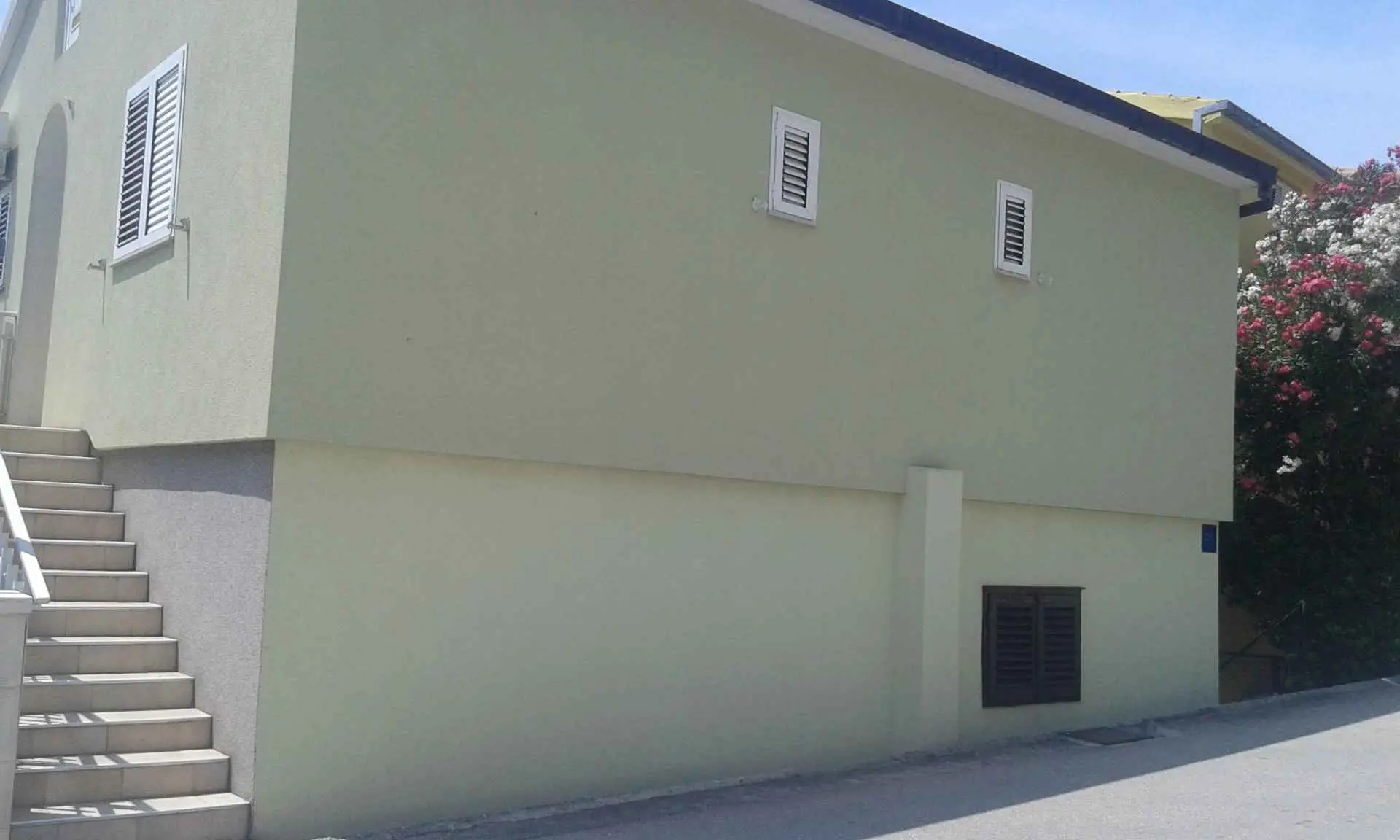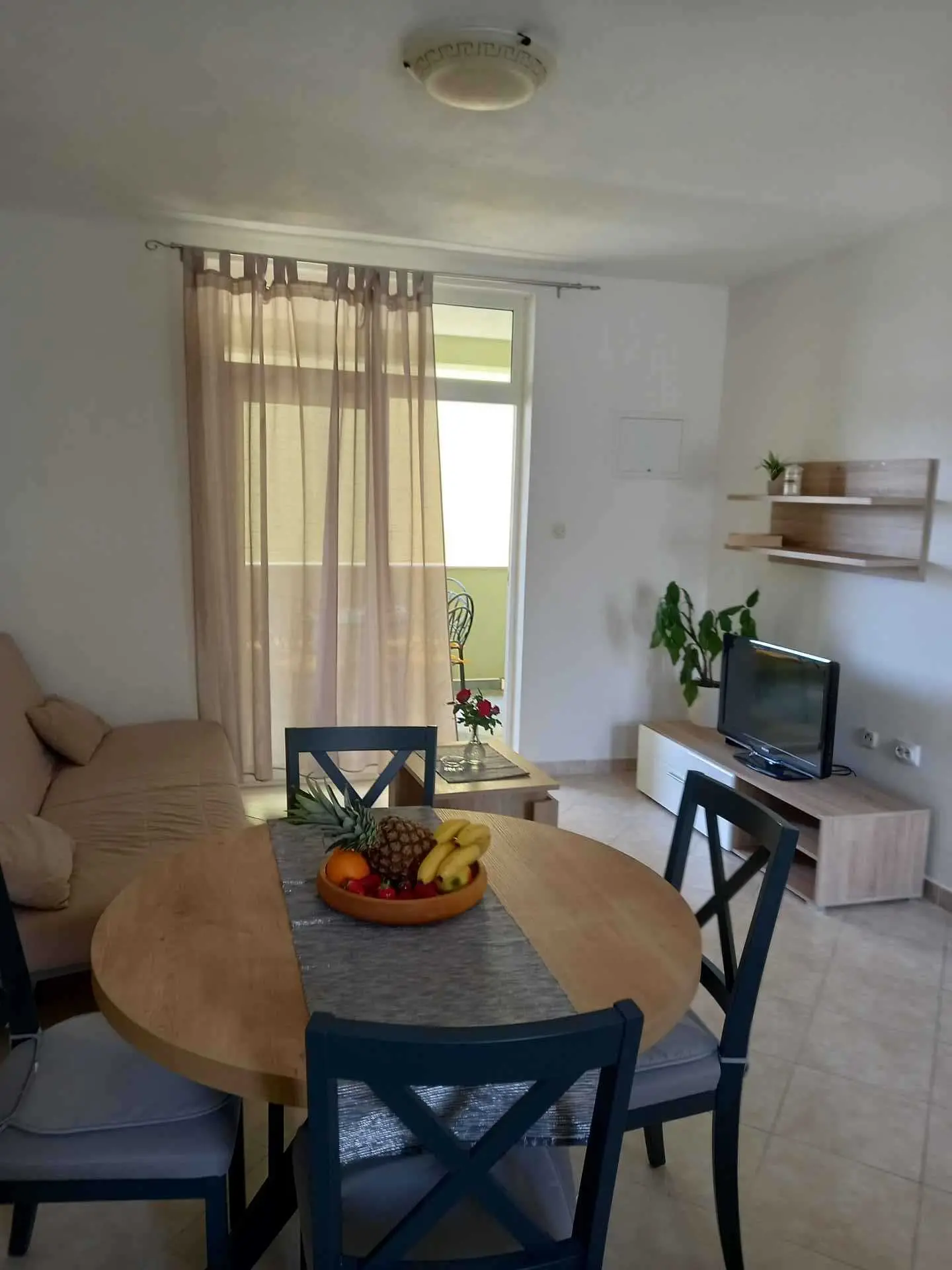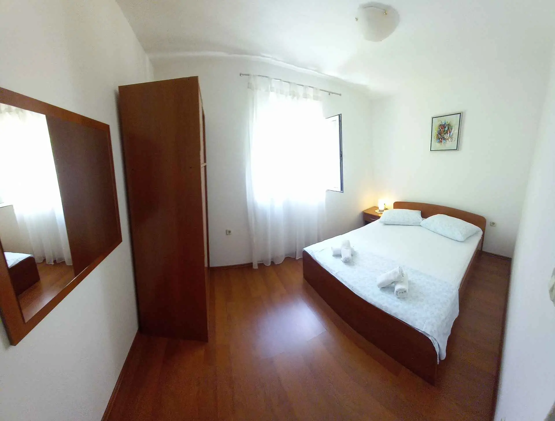 Az apartman a ház első emeletén található. Külön bejárattal rendelkezik, és 12 lépcső választja el a lakásba való belépéstől. A gyönyörű Baška Voda központjától mindössze 100 méterre, a híres strandoktól pedig 150 méterre található. Két szobából áll, mindegyik franciaággyal és külön fürdőszobával, valamint konyhával, nappalival és nagy erkéllyel. Minden szobában gardrób, éjjeliszekrény, éjjeli lámpa és tükör található. A fürdőszobák mindegyike saját zuhanyzóval és mosdóval rendelkezik. A konyha bútorozott és minden szükséges edényt tartalmaz, beleértve a hűtőszekrényt és a sütőt. A vendégek a nap 24 órájában használhatják a légkondicionálót is. A nappaliban egy összecsukható kanapé, egy kis asztal és egy polc található TV-vel. A nappali mellett van egy nagy erkély üvegasztallal és 4 székkel, valamint kilátással a gyönyörű Adriai-tengerre.