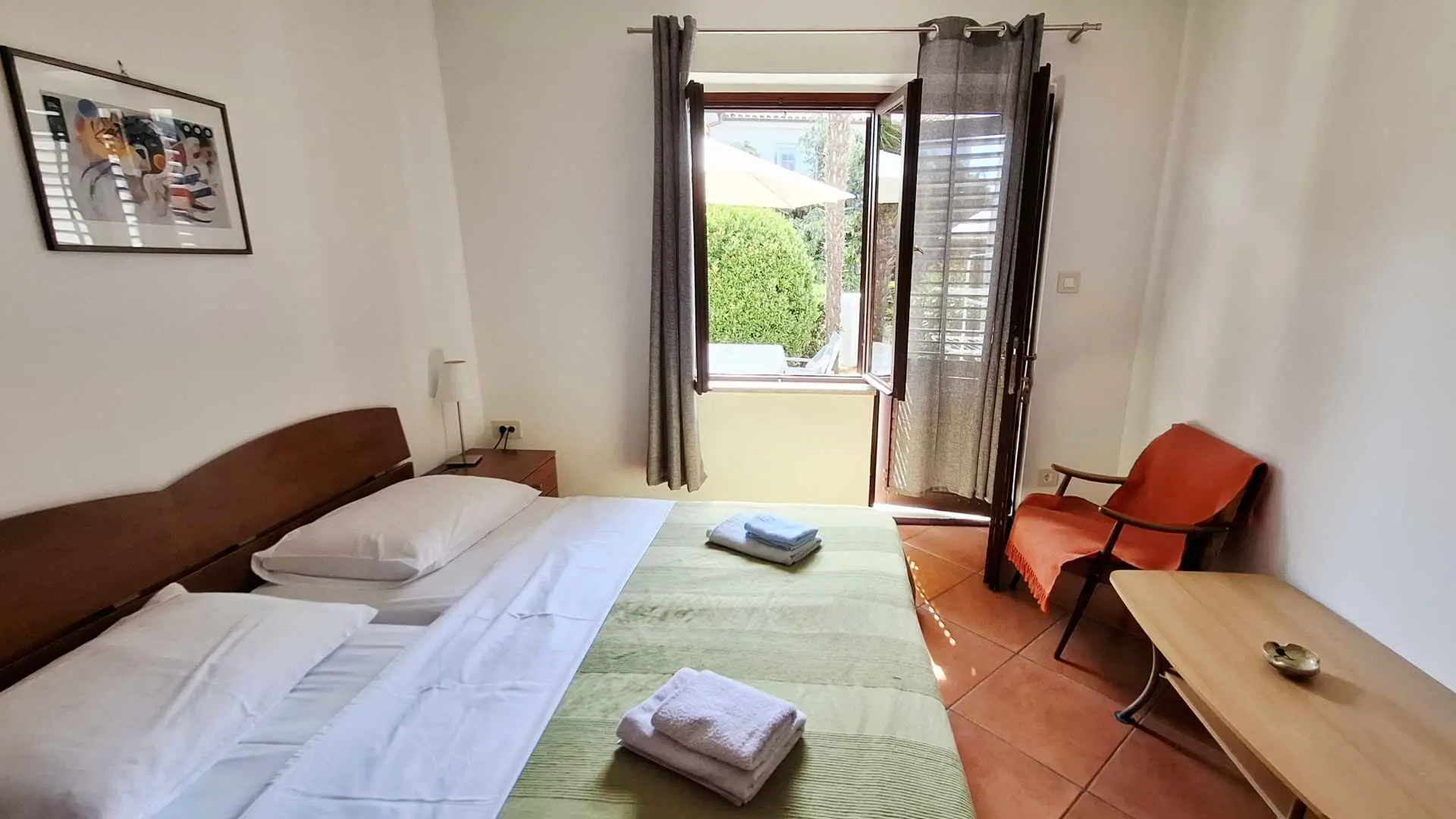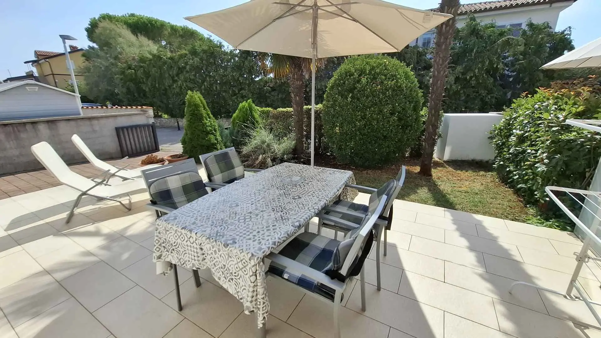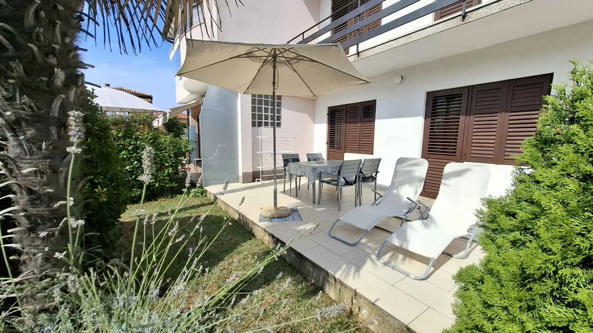 Az apartmanban két hálószoba található, az egyikben franciaágy, a másikban két különálló ágy található. Teljesen felszerelt konyha, légkondicionáló, zuhanyzós fürdőszoba, nagy terasz és kis saját kert található. Az ár tartalmazza az ingyenes privát parkolást egy autó számára, valamint az ingyenes Wi-Fi internet-hozzáférést. Az apartman a második sorban található a strandtól, mindössze tíz perc sétára a történelmi belvárostól, a bevásárlónegyedtől és a szupermarketektől.