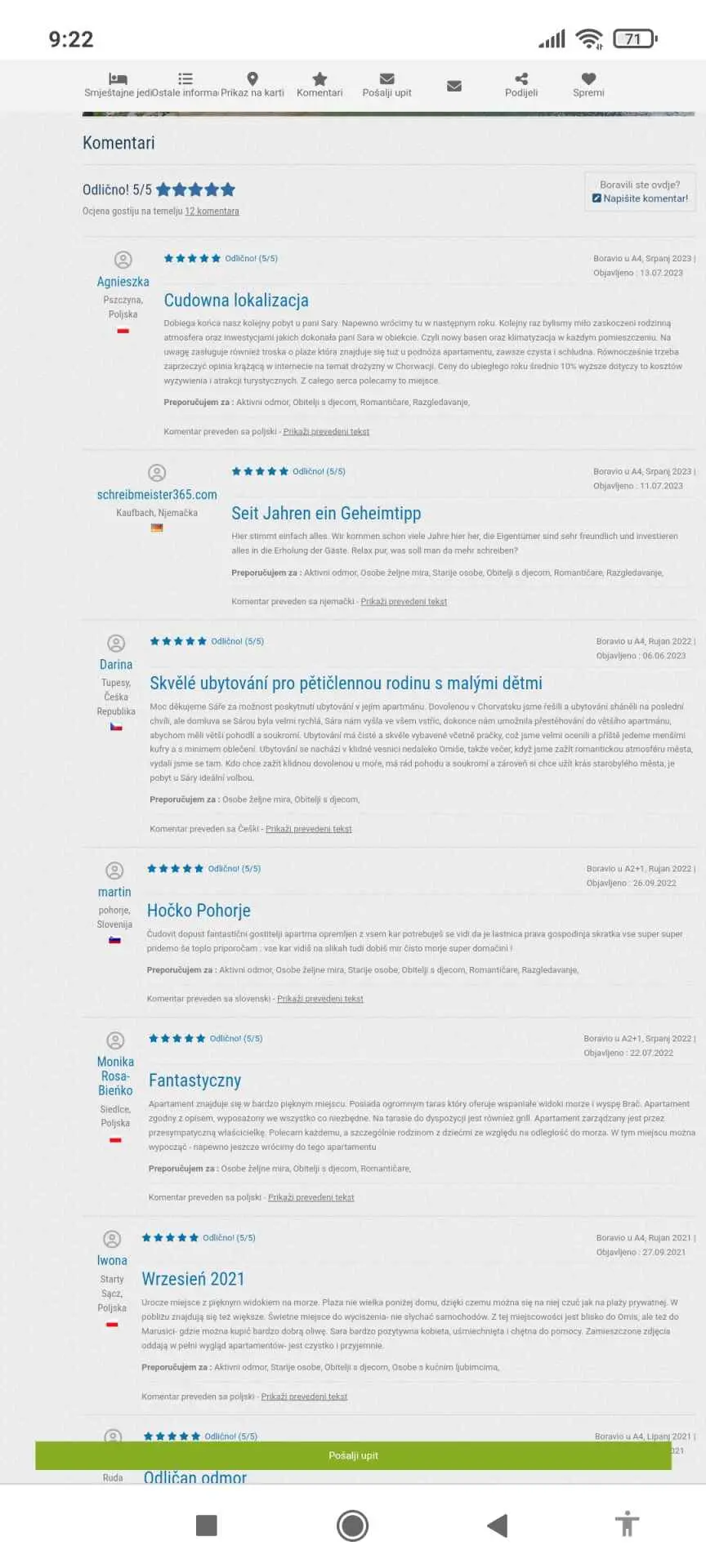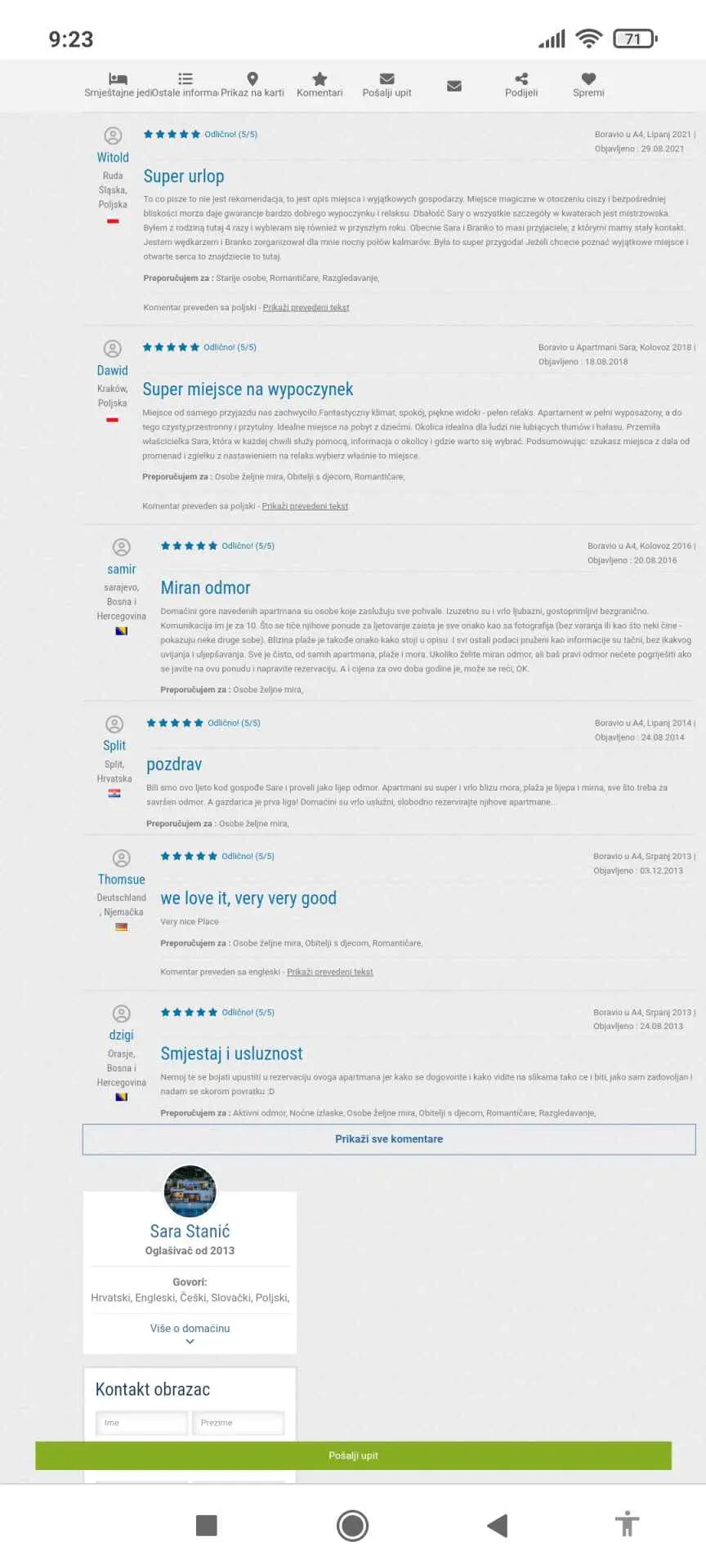 Miejsce jest cudowne, a widoki przepiękne. Kwatera jest doskonale wyposażona, czysta i zadbana. Właścicielka to najmilsza osoba w całej Chorwacji. Zawsze służyła radą i pomocą. Serdecznie polecamy zakwaterowanie u Sary.