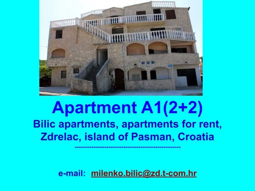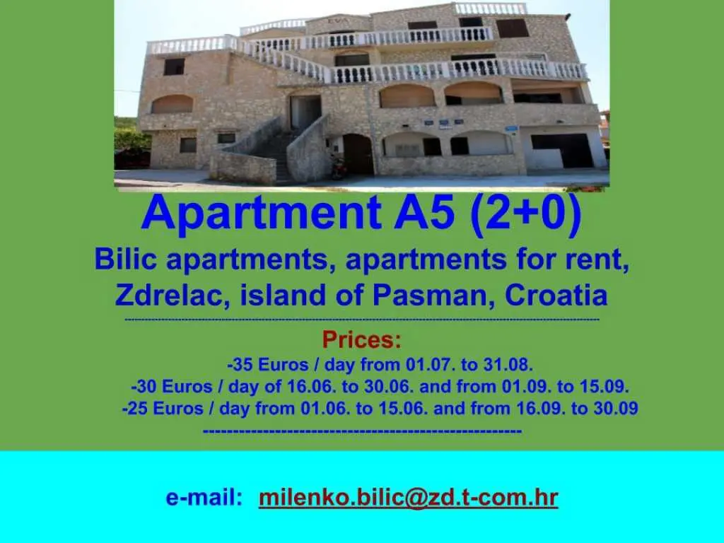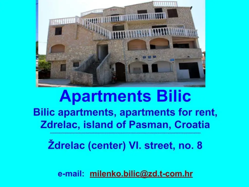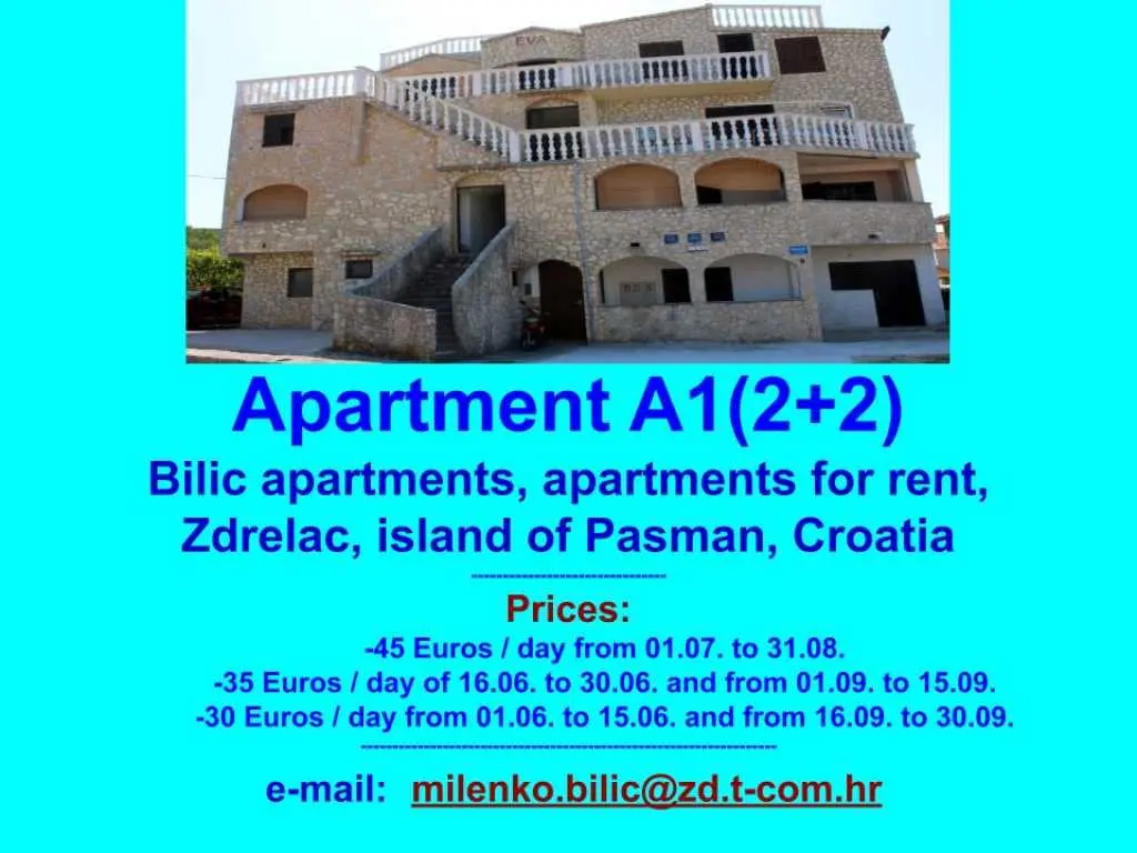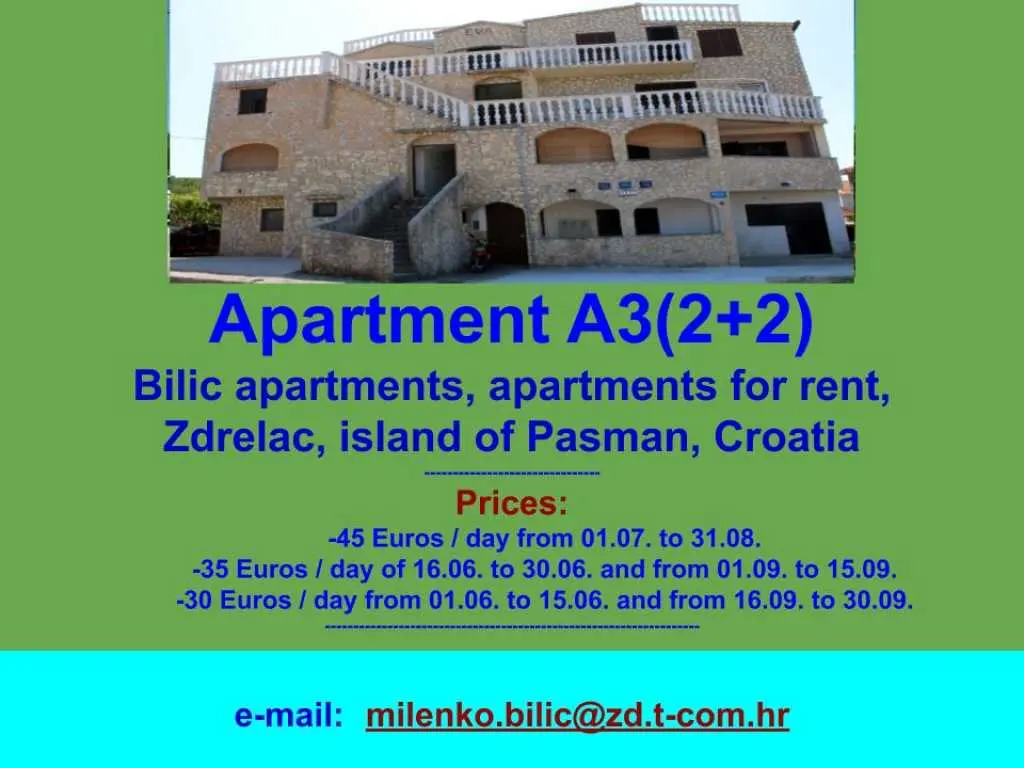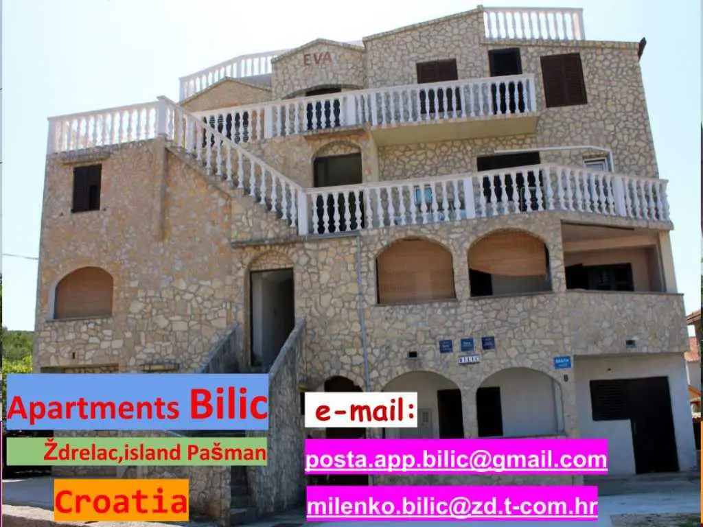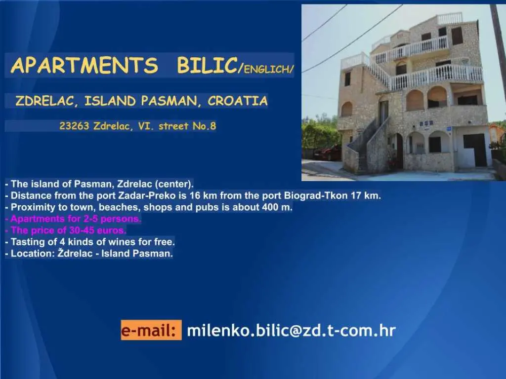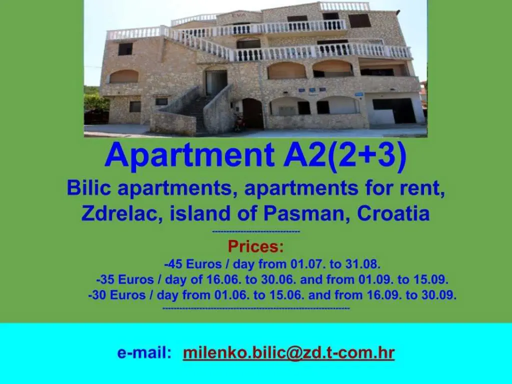 Apartments Bilic - Pasman, Zdrelac (középen). - Távolság a port Preko-Zadar 16 km-re a kikötőtől Tkon-Biograd 17 km. - Proximity a városba, strandok, üzletek és kocsmák, körülbelül 400 m. - Lakások 2-5 fő részére. - Ár 30-45 euró. - Helyszín: Ždrelac - Pasman sziget. - Leírás: a ház régi dalmát stílusú, az óváros, vidék, idilli helyzet, békés és csendes környezetben, az udvar zöld árnyékban van, kandalló a vendégek rendelkezésére, a háznak saját parkolója van, az udvaron kerti zuhanyzó, vendég ház áll közös terasz (100 m2). - Háziállat: nem megengedett háziállatok. ------------------ Apartmanok A1 (2 +2) Leírás: négy ágy, 30 m2, második emelet, nappali konyhával és ebédlővel, hálószoba (franciaágy), hálószoba (külön ágyak), fürdőszoba WC-vel, erkély (3 m2, dél). -Extra felszereltség: légkondicionáló, TV + SAT, rádió, mikrohullámú sütő. -Árak: -45 Euro / nap 01.07. a 31.08. -35 Euro / nap 16.06. a 30.06. és 01.09. a 15.09. -30 Euro / nap 01.06. a 15.06. és 16.09. a 30.09. -------------------- Apartmanok A2 (2 +3) -Leírás: két francia ágy, egy extra bed.30 m2, konyha, nappali és étkező (francia ágy, egy pótágy), hálószoba (franciaágy), WC, zuhanyzó, erkély (3 m2, dél). -Kiegészítő felszerelés: légkondicionáló, műholdas TV, rádió, mikrohullámú sütő. -Árak: -45 Euro / nap 01.07. a 31.08. -35 Euro / nap 16.06. a 30.06. és 01.09. a 15.09. -30 Euro / nap 01.06. a 15.06. és 16.09. a 30.09. -------------------- Apartmanok A3 (2 +2) -Leírás: négy ágy, 30 m2, első emelet, nappali konyhával és ebédlővel, hálószoba (franciaágy), hálószoba (franciaágy), fürdőszoba WC-vel, erkéllyel (4 m2, dél), apartman kilátással a tengerre . -Kiegészítő felszerelés: légkondicionáló, műholdas TV, rádió, mikrohullámú sütő. -Árak -45 Euro / nap 01.07. a 31.08. -35 Euro / nap 16.06. a 30.06. és 01.09. a 15.09. -30 Euro / nap 01.06. a 15.06. és 16.09. a 30.09. ------------------------ Stúdió apartman A4 (2 +1) -Leírás: két ágy, két pótággyal, 22 m2, első emelet, hálószoba, konyha és étkező, fürdőszoba WC-vel. -Kiegészítő felszerelés: légkondicionáló, műholdas TV, rádió, mikrohullámú sütő. -Árak: -30 Euro / nap 01.07. a 31.08. -25 Euro / nap 16.06. a 30.06. és 01.09. a 15.09. -20 Euro / nap 01.06. a 15.06. és 30.09. a 16.09. ---------------------------