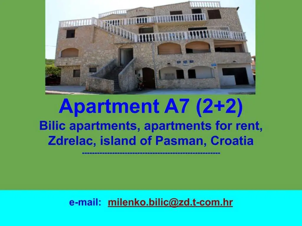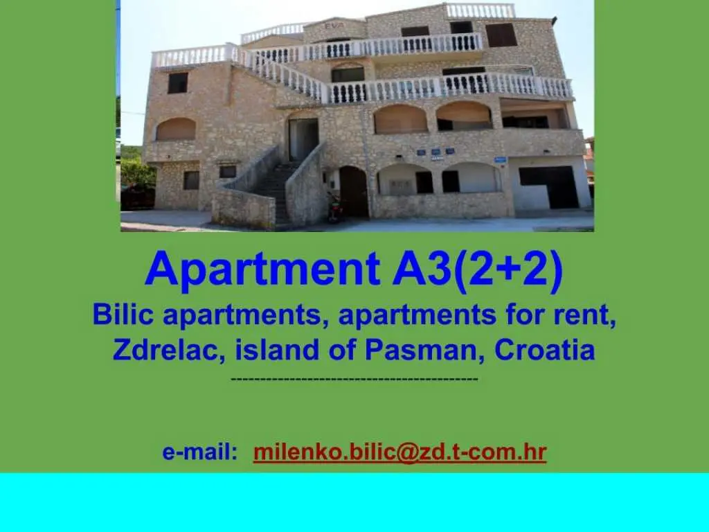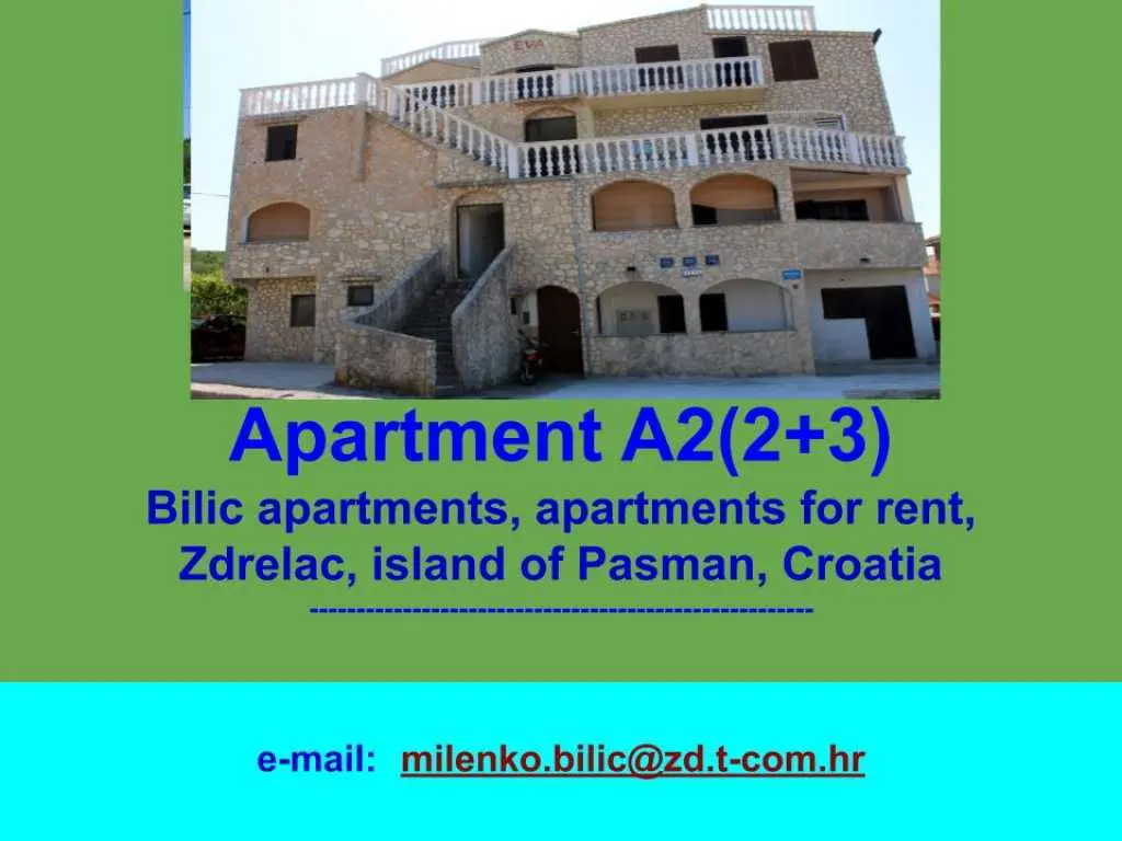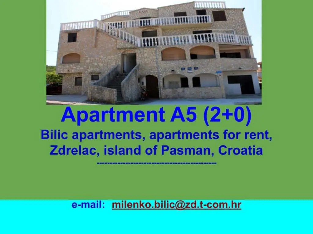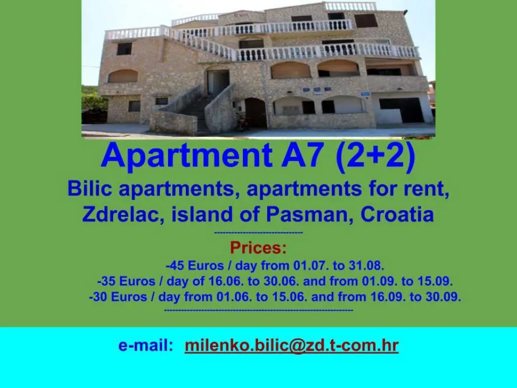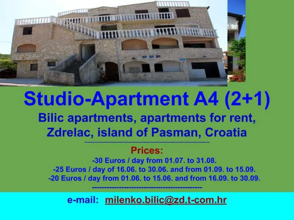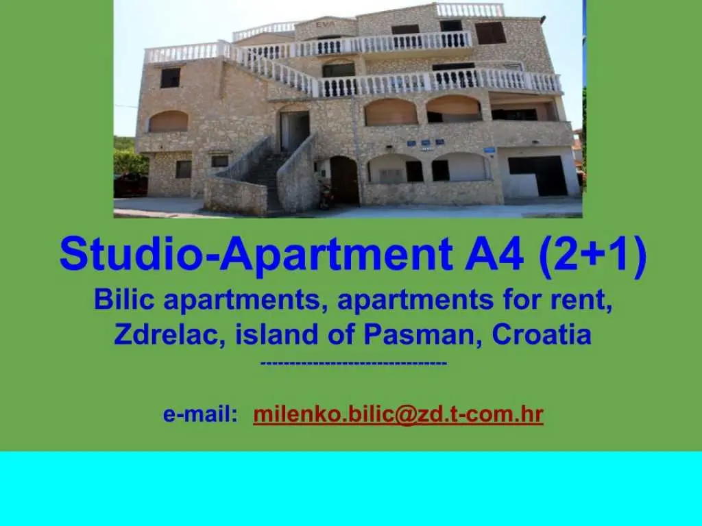 Apartments Bilic - Pasman, Zdrelac (középen). - Távolság a port Preko-Zadar 16 km-re a kikötőtől Tkon-Biograd 17 km. - Proximity a városba, strandok, üzletek és kocsmák, körülbelül 400 m. - Lakások 2-5 fő részére. - Ár 30-45 euró. - Helyszín: Ždrelac - Pasman sziget. - Leírás: a ház régi dalmát stílusú, az óváros, vidék, idilli helyzet, békés és csendes környezetben, az udvar zöld árnyékban van, kandalló a vendégek rendelkezésére, a háznak saját parkolója van, az udvaron kerti zuhanyzó, vendég ház áll közös terasz (100 m2). - Háziállat: nem megengedett háziállatok. ------------------ Apartmanok A1 (2 +2) Leírás: négy ágy, 30 m2, második emelet, nappali konyhával és ebédlővel, hálószoba (franciaágy), hálószoba (külön ágyak), fürdőszoba WC-vel, erkély (3 m2, dél). -Extra felszereltség: légkondicionáló, TV + SAT, rádió, mikrohullámú sütő. -Árak: -45 Euro / nap 01.07. a 31.08. -35 Euro / nap 16.06. a 30.06. és 01.09. a 15.09. -30 Euro / nap 01.06. a 15.06. és 16.09. a 30.09. -------------------- Apartmanok A2 (2 +3) -Leírás: két francia ágy, egy extra bed.30 m2, konyha, nappali és étkező (francia ágy, egy pótágy), hálószoba (franciaágy), WC, zuhanyzó, erkély (3 m2, dél). -Kiegészítő felszerelés: légkondicionáló, műholdas TV, rádió, mikrohullámú sütő. -Árak: -45 Euro / nap 01.07. a 31.08. -35 Euro / nap 16.06. a 30.06. és 01.09. a 15.09. -30 Euro / nap 01.06. a 15.06. és 16.09. a 30.09. -------------------- Apartmanok A3 (2 +2) -Leírás: négy ágy, 30 m2, első emelet, nappali konyhával és ebédlővel, hálószoba (franciaágy), hálószoba (franciaágy), fürdőszoba WC-vel, erkéllyel (4 m2, dél), apartman kilátással a tengerre . -Kiegészítő felszerelés: légkondicionáló, műholdas TV, rádió, mikrohullámú sütő. -Árak -45 Euro / nap 01.07. a 31.08. -35 Euro / nap 16.06. a 30.06. és 01.09. a 15.09. -30 Euro / nap 01.06. a 15.06. és 16.09. a 30.09. ------------------------ Stúdió apartman A4 (2 +1) -Leírás: két ágy, két pótággyal, 22 m2, első emelet, hálószoba, konyha és étkező, fürdőszoba WC-vel. -Kiegészítő felszerelés: légkondicionáló, műholdas TV, rádió, mikrohullámú sütő. -Árak: -30 Euro / nap 01.07. a 31.08. -25 Euro / nap 16.06. a 30.06. és 01.09. a 15.09. -20 Euro / nap 01.06. a 15.06. és 30.09. a 16.09. ---------------------------
