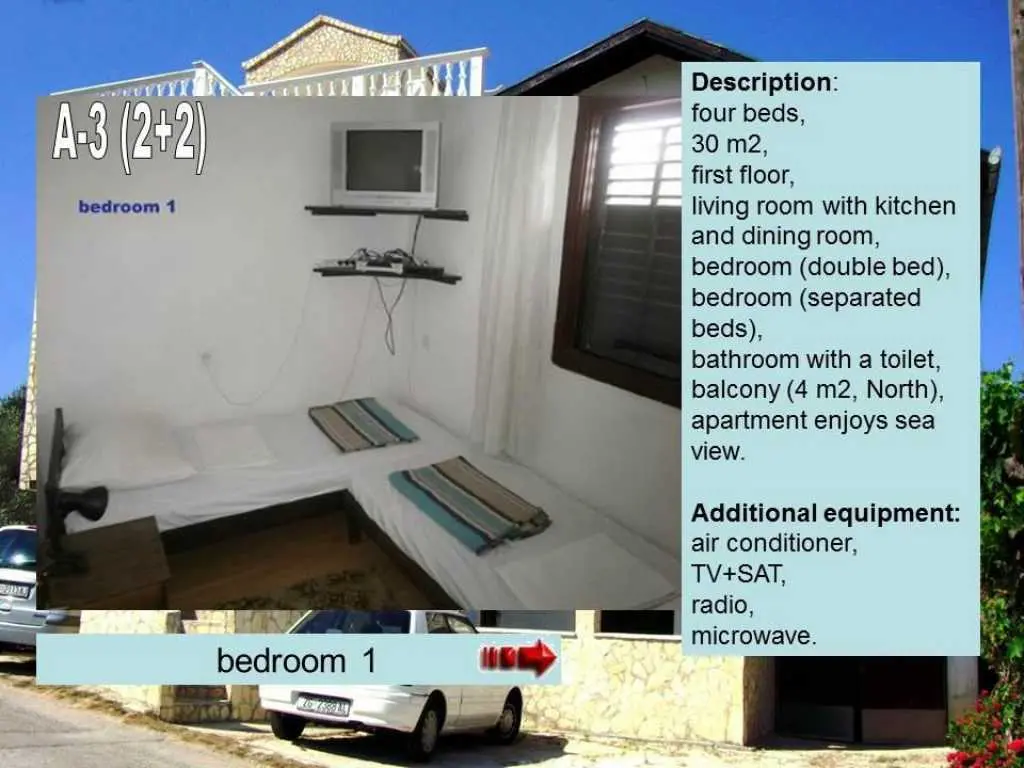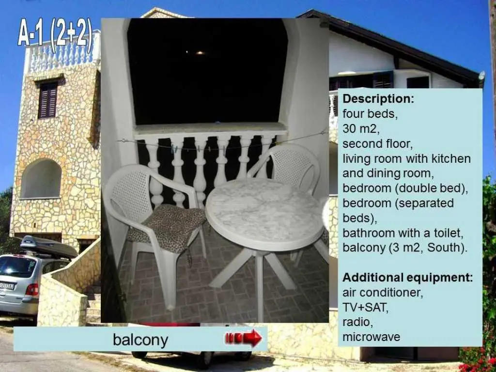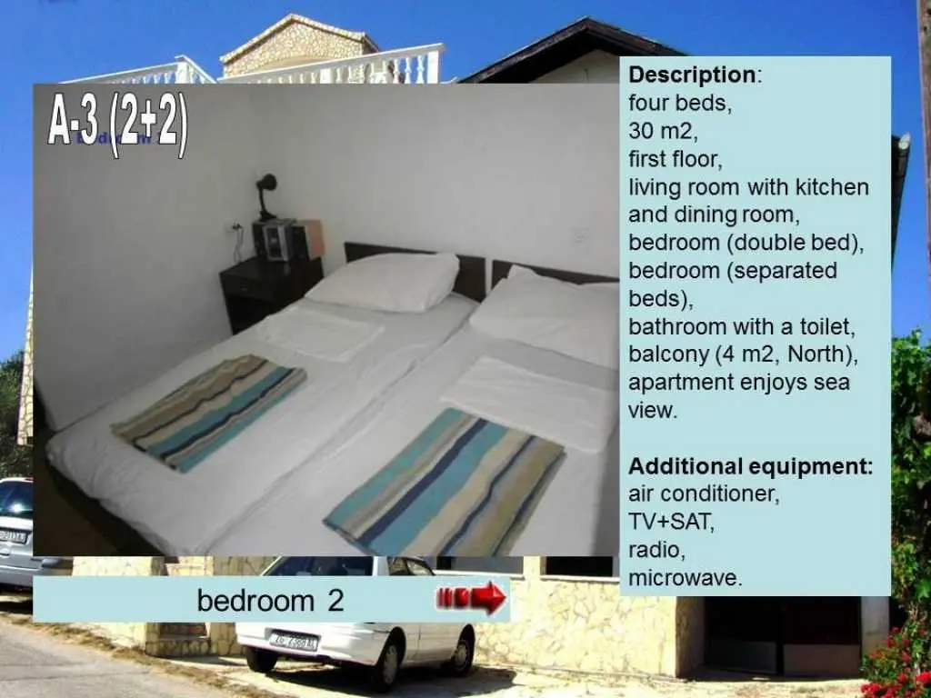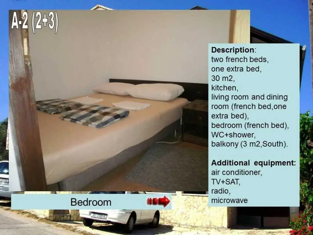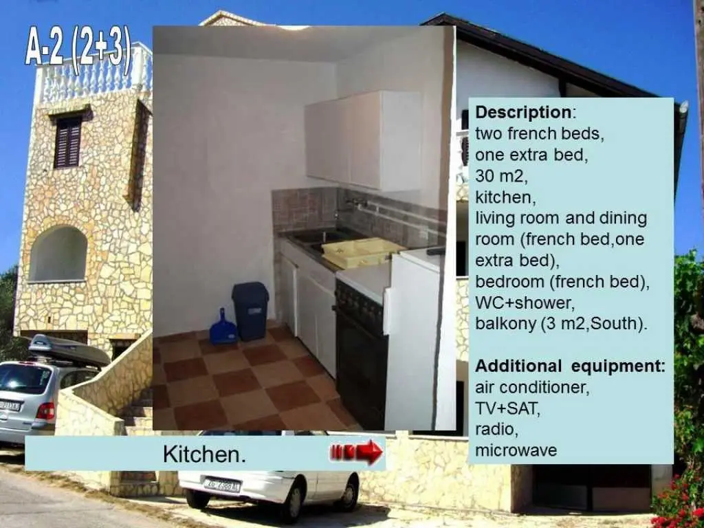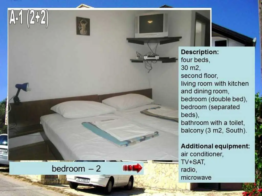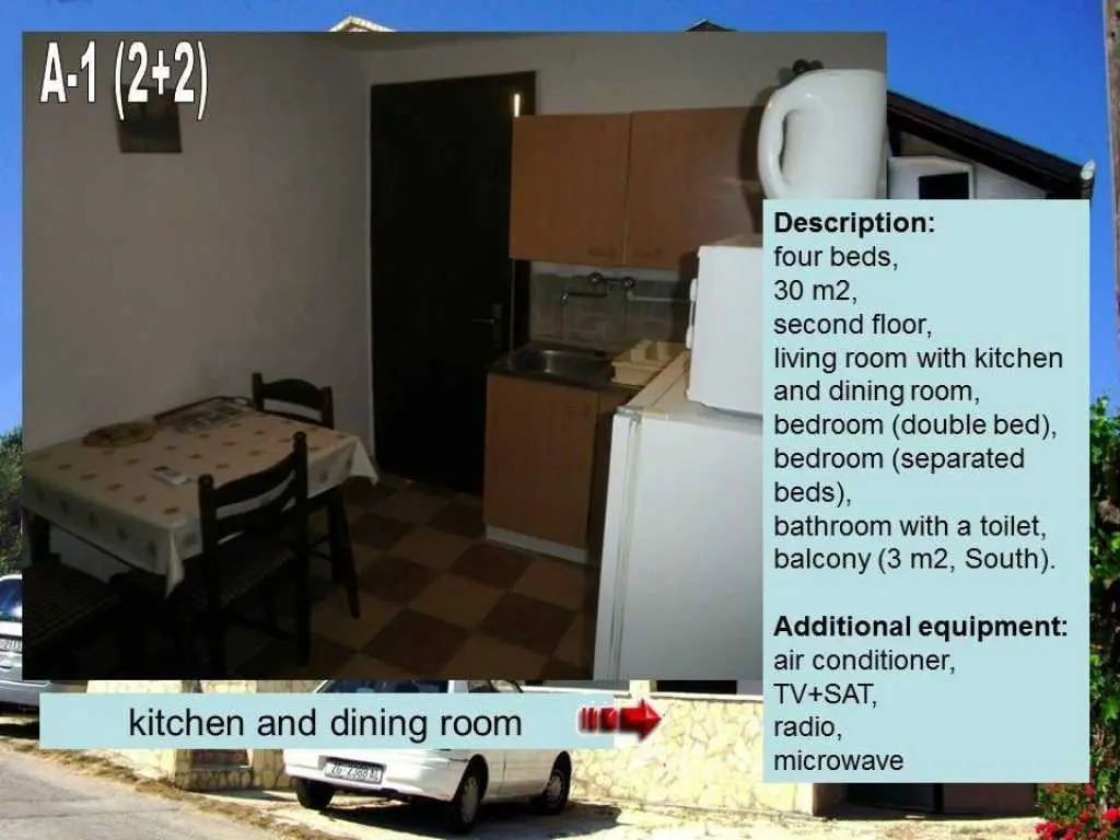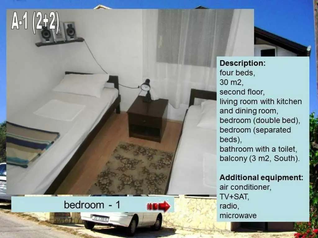 Apartments Bilic - Pasman, Zdrelac (középen). - Távolság a port Preko-Zadar 16 km-re a kikötőtől Tkon-Biograd 17 km. - Proximity a városba, strandok, üzletek és kocsmák, körülbelül 400 m. - Lakások 2-5 fő részére. - Ár 30-45 euró. - Helyszín: Ždrelac - Pasman sziget. - Leírás: a ház régi dalmát stílusú, az óváros, vidék, idilli helyzet, békés és csendes környezetben, az udvar zöld árnyékban van, kandalló a vendégek rendelkezésére, a háznak saját parkolója van, az udvaron kerti zuhanyzó, vendég ház áll közös terasz (100 m2). - Háziállat: nem megengedett háziállatok. ------------------ Apartmanok A1 (2 +2) Leírás: négy ágy, 30 m2, második emelet, nappali konyhával és ebédlővel, hálószoba (franciaágy), hálószoba (külön ágyak), fürdőszoba WC-vel, erkély (3 m2, dél). -Extra felszereltség: légkondicionáló, TV + SAT, rádió, mikrohullámú sütő. -Árak: -45 Euro / nap 01.07. a 31.08. -35 Euro / nap 16.06. a 30.06. és 01.09. a 15.09. -30 Euro / nap 01.06. a 15.06. és 16.09. a 30.09. -------------------- Apartmanok A2 (2 +3) -Leírás: két francia ágy, egy extra bed.30 m2, konyha, nappali és étkező (francia ágy, egy pótágy), hálószoba (franciaágy), WC, zuhanyzó, erkély (3 m2, dél). -Kiegészítő felszerelés: légkondicionáló, műholdas TV, rádió, mikrohullámú sütő. -Árak: -45 Euro / nap 01.07. a 31.08. -35 Euro / nap 16.06. a 30.06. és 01.09. a 15.09. -30 Euro / nap 01.06. a 15.06. és 16.09. a 30.09. -------------------- Apartmanok A3 (2 +2) -Leírás: négy ágy, 30 m2, első emelet, nappali konyhával és ebédlővel, hálószoba (franciaágy), hálószoba (franciaágy), fürdőszoba WC-vel, erkéllyel (4 m2, dél), apartman kilátással a tengerre . -Kiegészítő felszerelés: légkondicionáló, műholdas TV, rádió, mikrohullámú sütő. -Árak -45 Euro / nap 01.07. a 31.08. -35 Euro / nap 16.06. a 30.06. és 01.09. a 15.09. -30 Euro / nap 01.06. a 15.06. és 16.09. a 30.09. ------------------------ Stúdió apartman A4 (2 +1) -Leírás: két ágy, két pótággyal, 22 m2, első emelet, hálószoba, konyha és étkező, fürdőszoba WC-vel. -Kiegészítő felszerelés: légkondicionáló, műholdas TV, rádió, mikrohullámú sütő. -Árak: -30 Euro / nap 01.07. a 31.08. -25 Euro / nap 16.06. a 30.06. és 01.09. a 15.09. -20 Euro / nap 01.06. a 15.06. és 30.09. a 16.09. ---------------------------