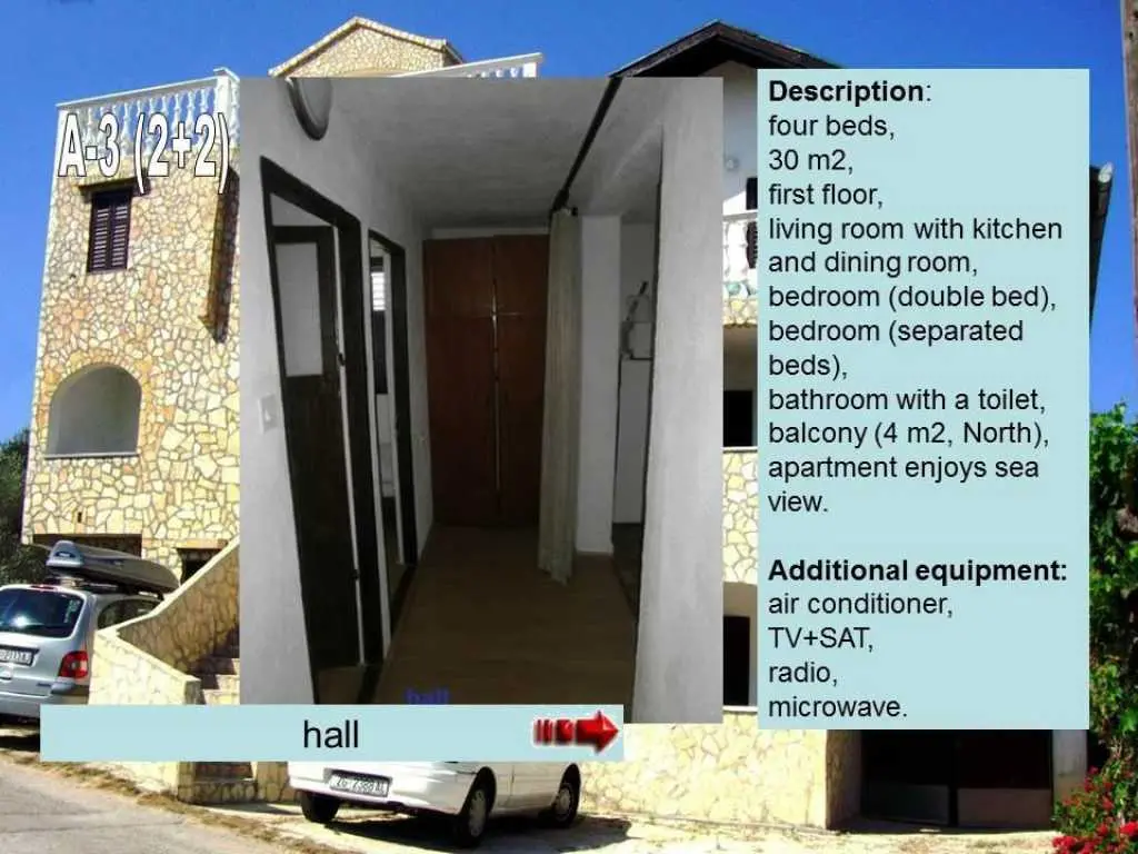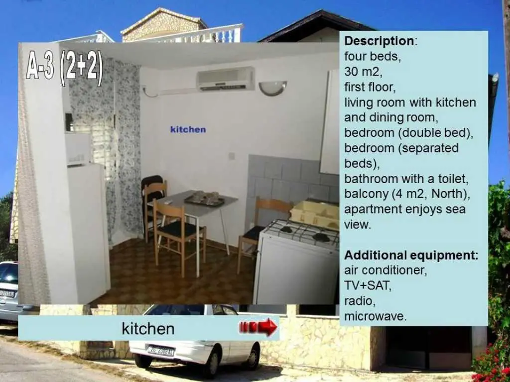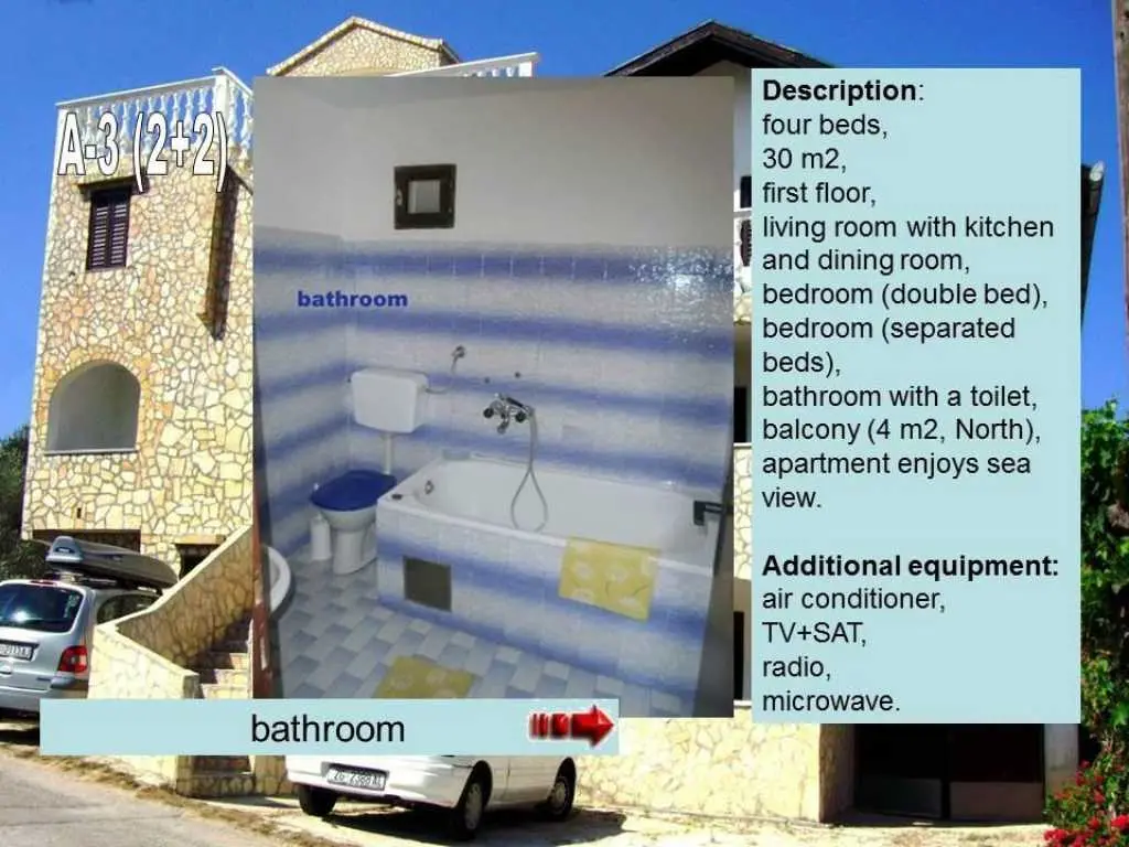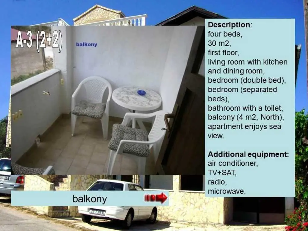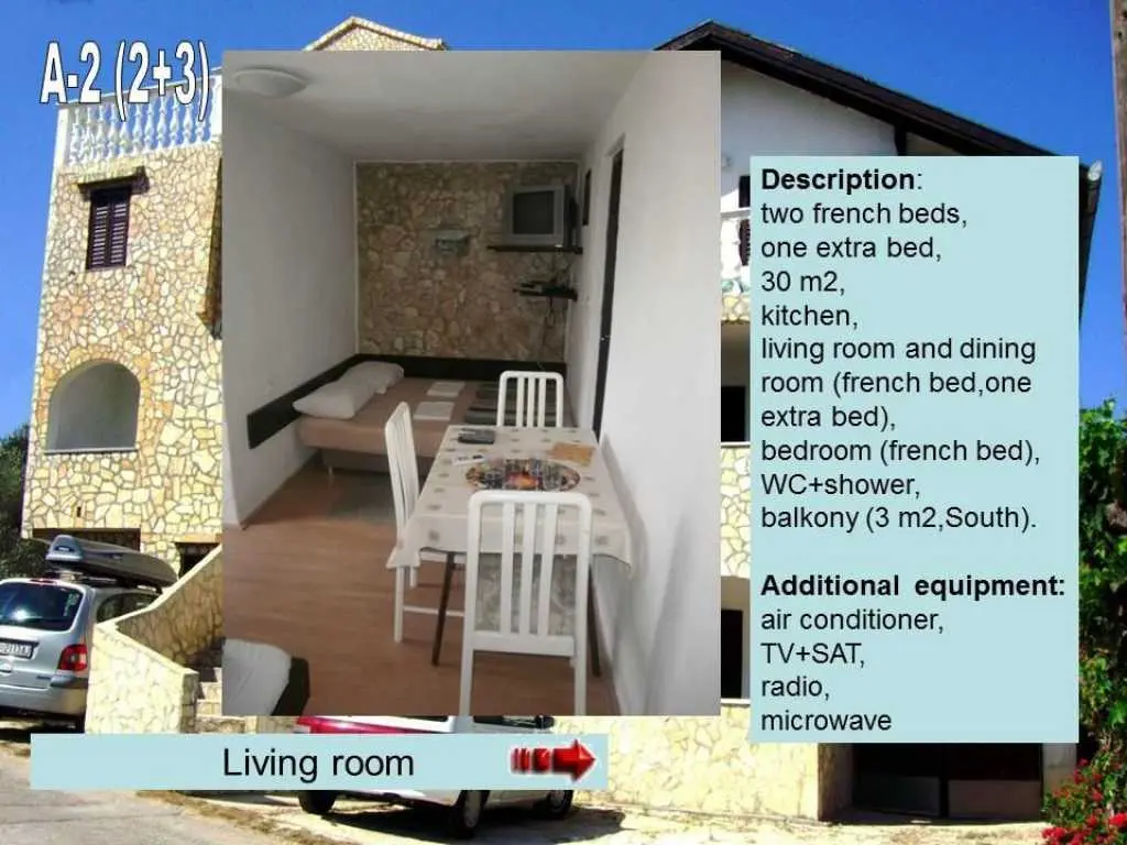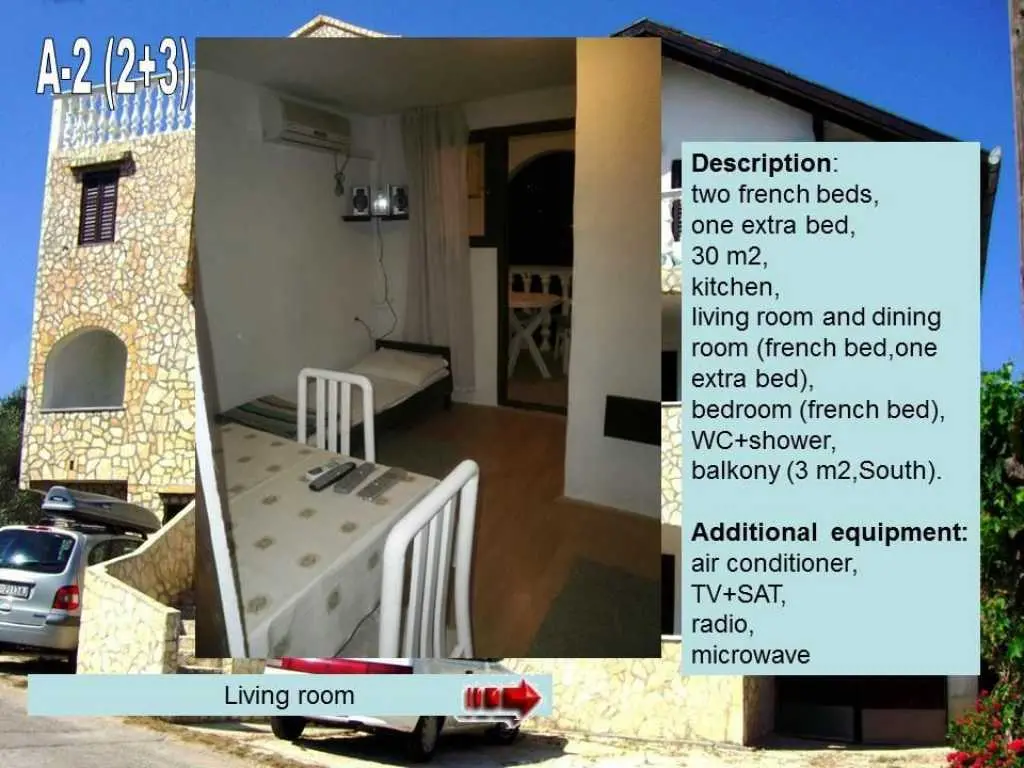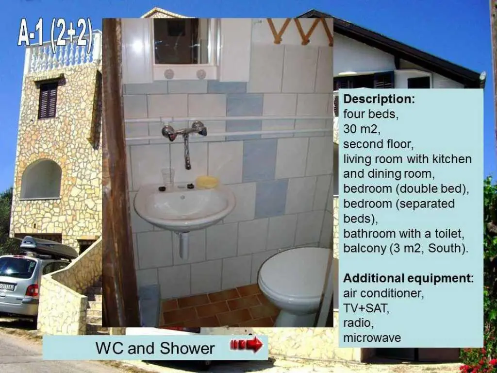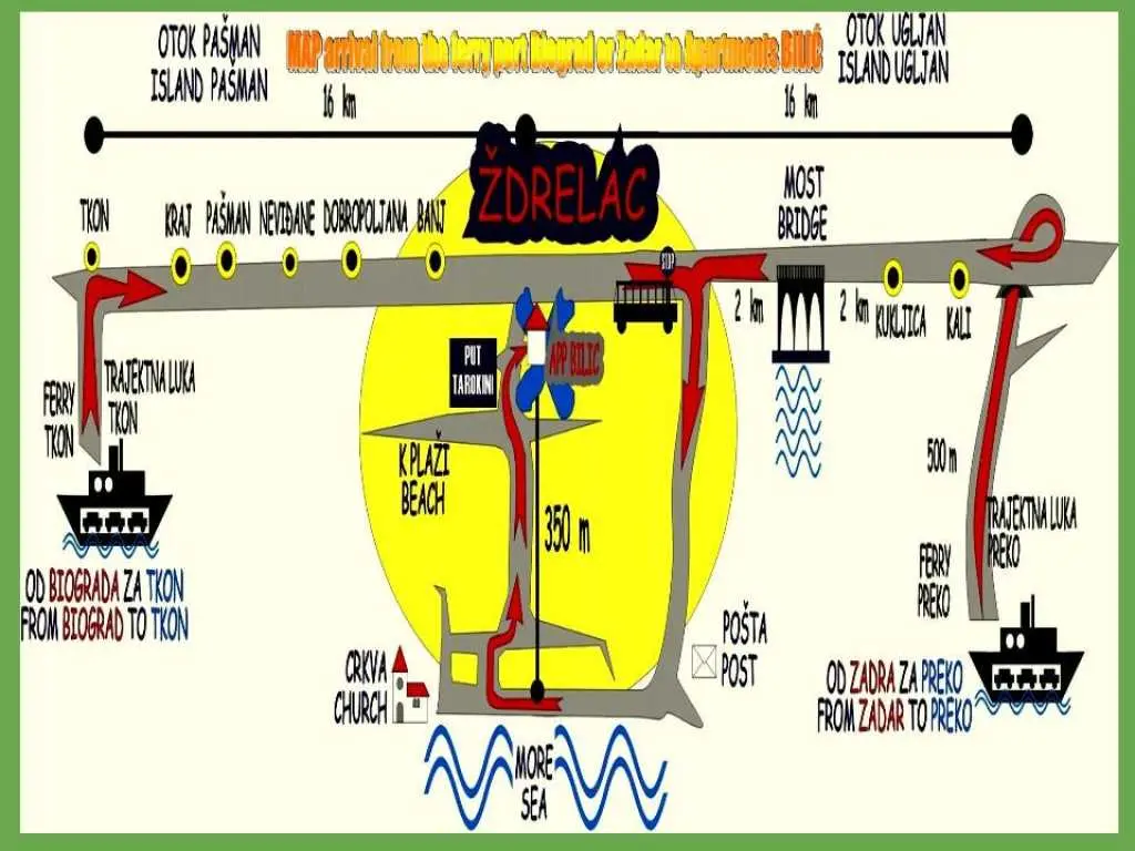 Apartments Bilic - Pasman, Zdrelac (középen). - Távolság a port Preko-Zadar 16 km-re a kikötőtől Tkon-Biograd 17 km. - Proximity a városba, strandok, üzletek és kocsmák, körülbelül 400 m. - Lakások 2-5 fő részére. - Ár 30-45 euró. - Helyszín: Ždrelac - Pasman sziget. - Leírás: a ház régi dalmát stílusú, az óváros, vidék, idilli helyzet, békés és csendes környezetben, az udvar zöld árnyékban van, kandalló a vendégek rendelkezésére, a háznak saját parkolója van, az udvaron kerti zuhanyzó, vendég ház áll közös terasz (100 m2). - Háziállat: nem megengedett háziállatok. ------------------ Apartmanok A1 (2 +2) Leírás: négy ágy, 30 m2, második emelet, nappali konyhával és ebédlővel, hálószoba (franciaágy), hálószoba (külön ágyak), fürdőszoba WC-vel, erkély (3 m2, dél). -Extra felszereltség: légkondicionáló, TV + SAT, rádió, mikrohullámú sütő. -Árak: -45 Euro / nap 01.07. a 31.08. -35 Euro / nap 16.06. a 30.06. és 01.09. a 15.09. -30 Euro / nap 01.06. a 15.06. és 16.09. a 30.09. -------------------- Apartmanok A2 (2 +3) -Leírás: két francia ágy, egy extra bed.30 m2, konyha, nappali és étkező (francia ágy, egy pótágy), hálószoba (franciaágy), WC, zuhanyzó, erkély (3 m2, dél). -Kiegészítő felszerelés: légkondicionáló, műholdas TV, rádió, mikrohullámú sütő. -Árak: -45 Euro / nap 01.07. a 31.08. -35 Euro / nap 16.06. a 30.06. és 01.09. a 15.09. -30 Euro / nap 01.06. a 15.06. és 16.09. a 30.09. -------------------- Apartmanok A3 (2 +2) -Leírás: négy ágy, 30 m2, első emelet, nappali konyhával és ebédlővel, hálószoba (franciaágy), hálószoba (franciaágy), fürdőszoba WC-vel, erkéllyel (4 m2, dél), apartman kilátással a tengerre . -Kiegészítő felszerelés: légkondicionáló, műholdas TV, rádió, mikrohullámú sütő. -Árak -45 Euro / nap 01.07. a 31.08. -35 Euro / nap 16.06. a 30.06. és 01.09. a 15.09. -30 Euro / nap 01.06. a 15.06. és 16.09. a 30.09. ------------------------ Stúdió apartman A4 (2 +1) -Leírás: két ágy, két pótággyal, 22 m2, első emelet, hálószoba, konyha és étkező, fürdőszoba WC-vel. -Kiegészítő felszerelés: légkondicionáló, műholdas TV, rádió, mikrohullámú sütő. -Árak: -30 Euro / nap 01.07. a 31.08. -25 Euro / nap 16.06. a 30.06. és 01.09. a 15.09. -20 Euro / nap 01.06. a 15.06. és 30.09. a 16.09. ---------------------------