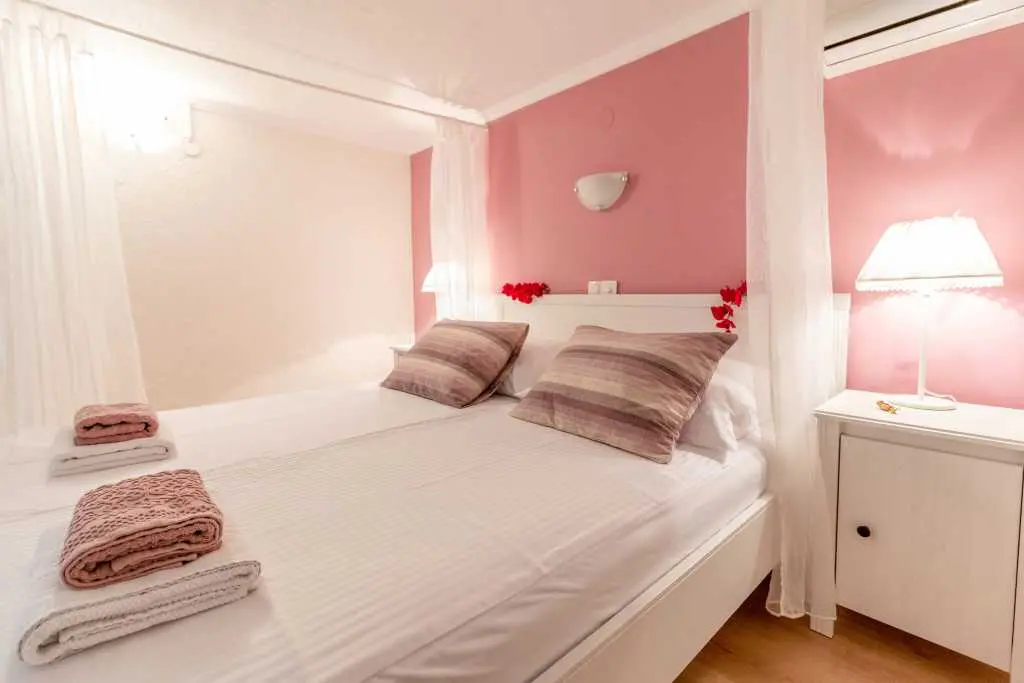 A Vintage Apartments épülete Banjolban, Rab szigetén található, mindössze 5 perces sétára a strandtól, 3 percre egy kis üzlettől és 5 perces autóútra a szupermarkettől. Rijeka repülőtere 100 km-re található, ahová felár ellenében transzfer is rendelkezésre áll. Az apartmanokba érkezéskor egy kis figyelem övezi - hagyományos Rab torta, házi bor, hideg italok a hűtőben, csokoládé, .. Minden apartman légkondicionált, síkképernyős műholdas TV-vel, hűtőszekrénnyel, mikrohullámú sütővel, mosogatógép, hajszárító, .. Az ingatlan minden egysége saját fürdőszobával és ágyneművel rendelkezik. A privát terasz minden apartman nélkülözhetetlen kelléke, ahol a reggeli kávé mellett vagy az esti kikapcsolódás mellett is pihenhet. Vendégeink számára ingyenes parkolást és wifit biztosítunk. Az ingatlanhoz tartozik egy nagy kert trambulinnal, különböző játszóterekkel és grillezővel - tökéletes gyermekes családok számára. A Vintage Apartments Rab városának népszerű látnivalóinak közelében található, mint például a Rab harangtornyok, a városfalak, a paloták és más épületek. Rab óvárosa egy középkori város, jól megőrzött városfalakkal, és a fő jellegzetessége a négy harangtorony, amelyek a várost négy árbocos vitorlás hajóhoz hasonlítják, valamint a Boldogságos Szűz Mária Mennybemenetele székesegyház. , a Szent János evangélista templom, a Szent András apostol templom és a Szent Justinus templom. A gazdag örökséggel rendelkező Rab egy álomcélpont, amelyet gyönyörű türkizkék tenger jellemez, és partjaink legnagyobb számú homokos strandjával rendelkező sziget. Az aktív vendégek számára kerékpáros és túraútvonalak állnak rendelkezésre, amelyek az egész szigeten húzódnak. A bájos apartmanok 2018-ban modern felújításon és dekoráción estek át, így mindent megadnak, ami egy tökéletes nyaraláshoz szükséges. A Vintage apartmanokat ritkán látogatják a vendégek. Az apartmanokba látogatók mindig nagy örömmel térnek vissza, ezért odafigyelünk azokra az apró részletekre, amelyek lelket, karizmát adnak a lakásnak, és otthon érezhetik magukat.